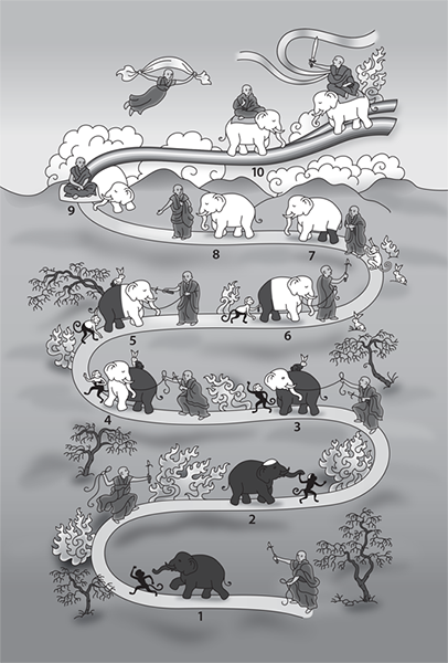 The monk is the meditator. The rope he holds represents vigilant, alert mindfulness.